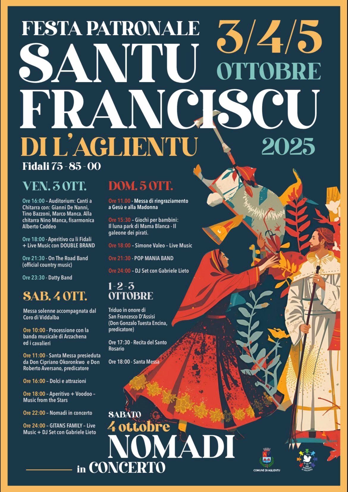 Dal 3 al 5 ottobre 2025 L’Aglientu celebra la Festa Patronale di Santu Francìscu con un programma ricco di eventi religiosi, spettacoli musicali e intrattenimento per tutte le età. Ospiti d’eccezione i Nomadi, in concerto sabato 4 ottobre.